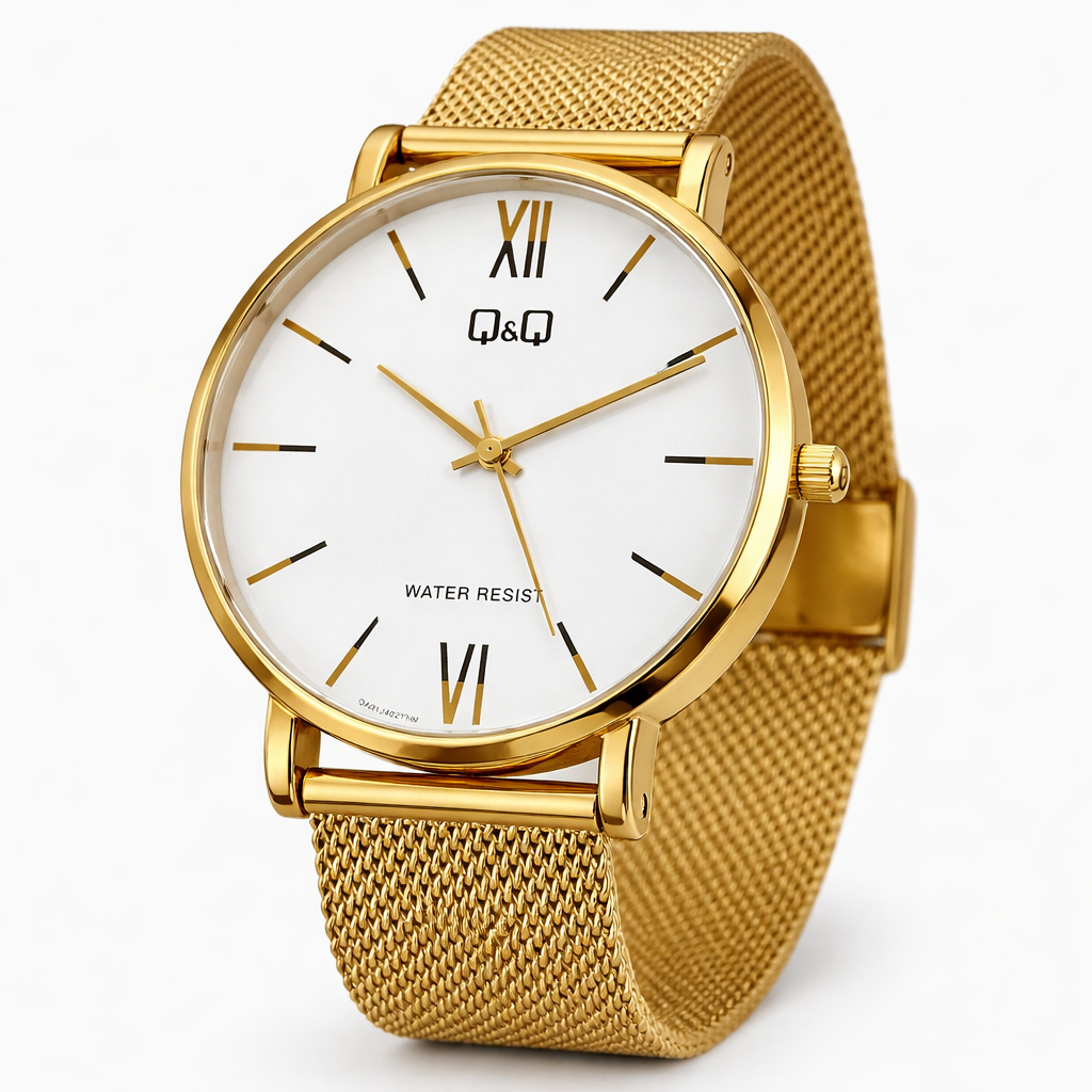 Movimiento analógico de tres manecillas – Caja en acero inoxidable dorado – Tamaño aproximado: 38 × 40 × 7.5 mm – Peso aproximado: 55 g – Cristal mineral resistente – Esfera blanca con números romanos indicadores solo de XII Y VI (12 y 6) – Pulso en acero inoxidable dorado con Tipo de cierre: ajustable deslizante (broche corredizo) – Resistencia al agua: uso diario
